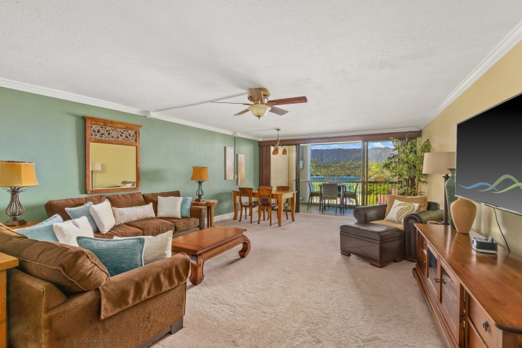 One bedroom lockout with living room, full kitchen with laundry, bath, and private lanais. King bed with luxury hotel linens, flat screen TV. Wake up to sunrise on Hanalei Bay.